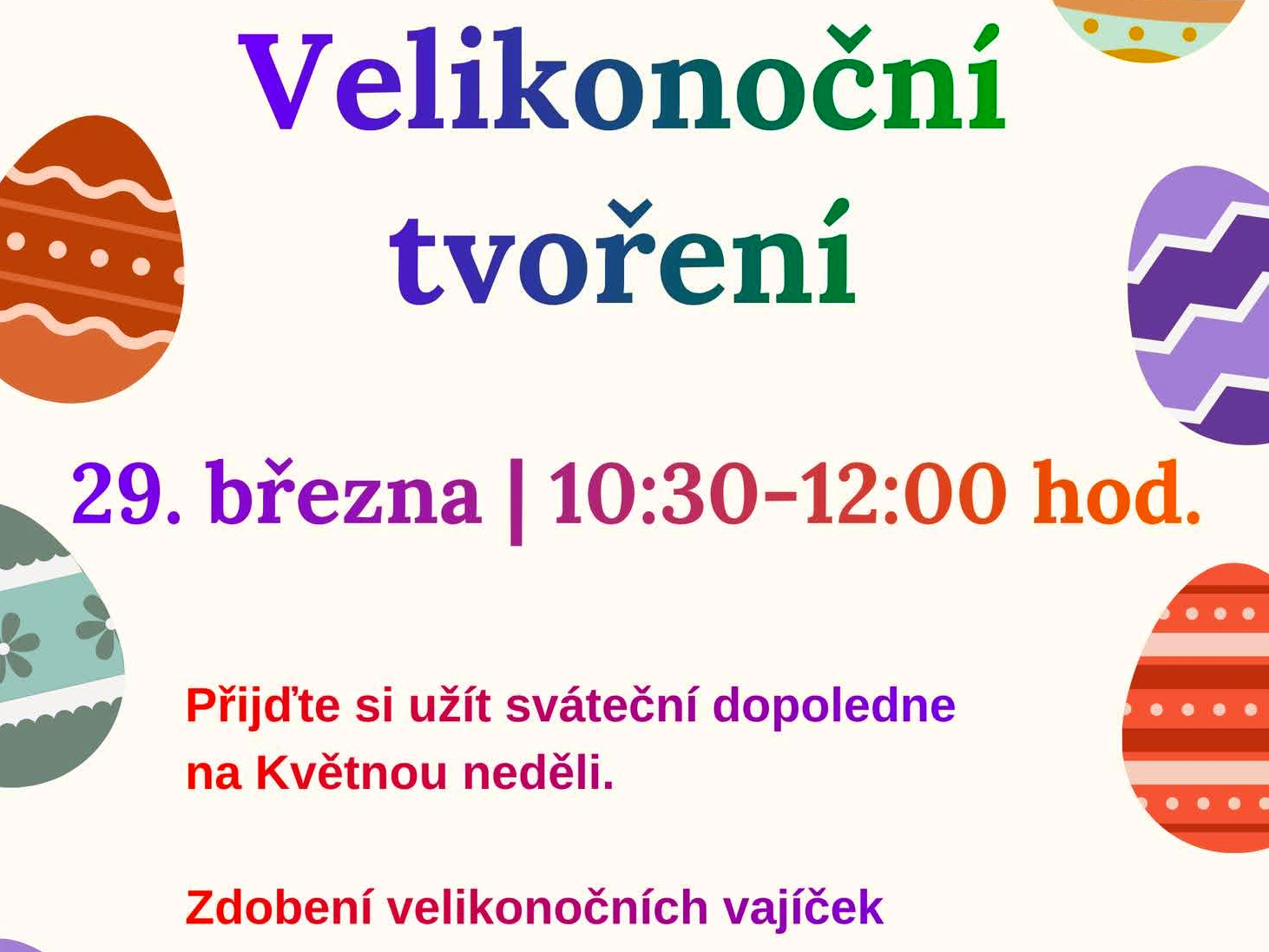 Přijďte si společně s dětmi i dospělými vyzdobit velikonoční vajíčka, zastavit se v předvelikonočním čase a prožít tvořivé dopoledne plné barev, klidu a sdílení. Vstup je zdarma a vítán je každý, kdo chce načerpat sváteční náladu.