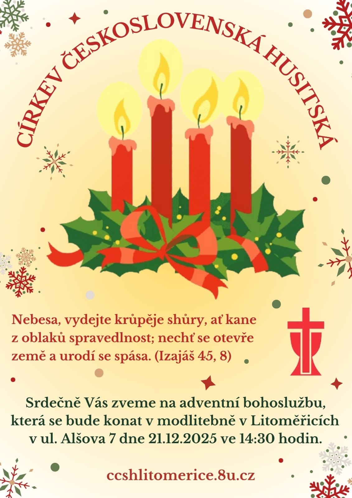 Srdečně vás zveme na adventní bohoslužbu, která se uskuteční v neděli 21. prosince 2025 od 14:30 hodin v modlitebně CČSH v Litoměřicích, ul. Alšova 7.